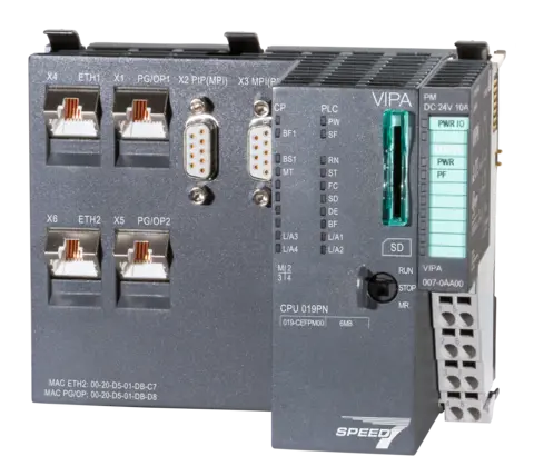 SLIO CPU 019 is a very powerful Profinet CPU from VIPA, suitable for high end automation. The CPU has built-in dual PROFINET controllers. It has an integrated working memory of 6MB, more than enough for almost every automation project. Double PG/OP ports (switch) over Ethernet and MPI are standard. The CPU 019 can also be configured as Profibus master or Profibus slave with a special FSC (Feature Sets Code) on an SD card. It also can be set up as a Modbus master or Modbus slave.