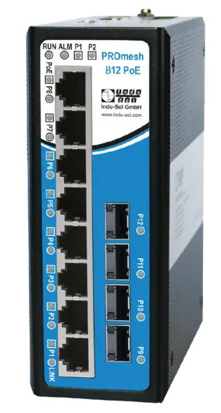 ■ Link aggregation ■ 802.1X authentication (radius) ■ Extended temperature range from -40°C to +75°C ■ Deployment at the centre of your network thanks to highspeed of up to 2.5 Gbit/s and further scalability thanks to Link Aggregation. ■ The PROmesh B12 PoE is a fully-managed Industrial Ethernet switch for use in industrial automation systems. ■ You can configure it easily and conveniently via its integrated web interface. ■ Due to the extended temperature range temperature range, the PROmesh B12 PoE in can also be used in locations subject to high thermal loads. ■ Extensive diagnostic functions: Find out about your network status at any time.
